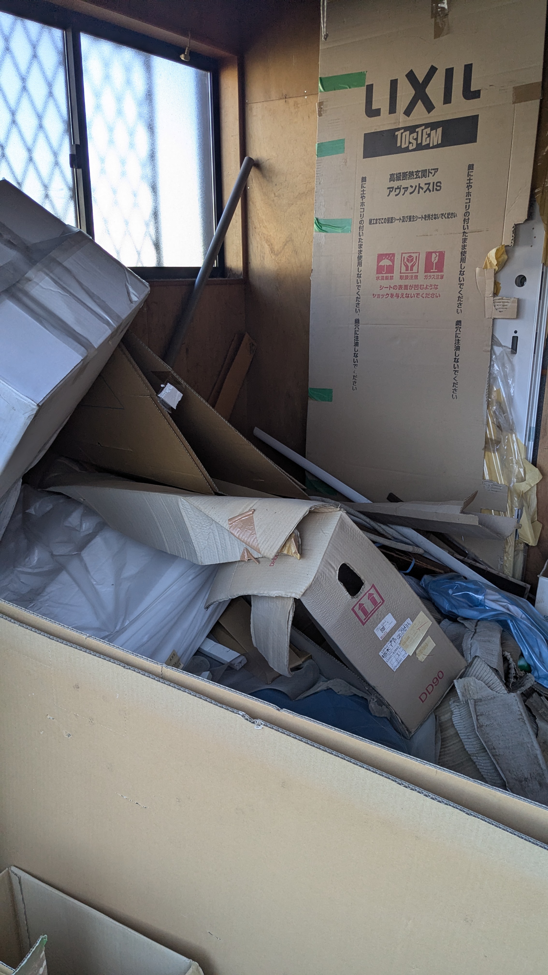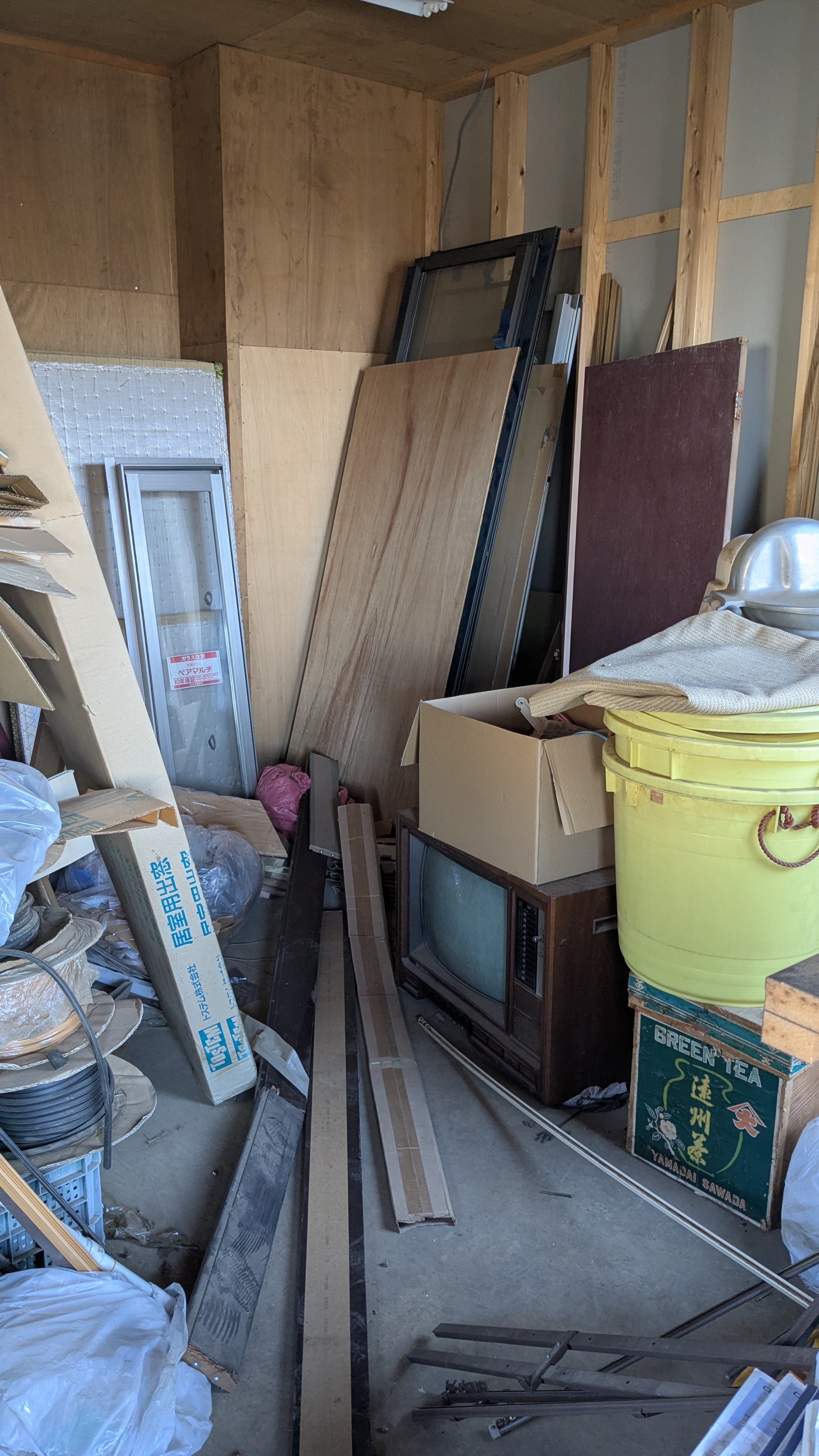 倉庫内には、建築関係の廃材やサッシ、畳等々建物裏手まである状態です。